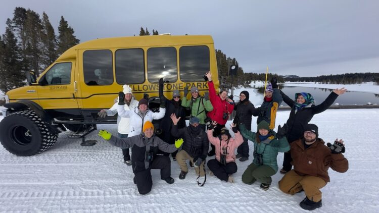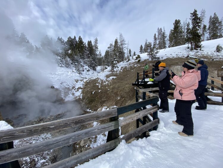 Enjoying the views at Fishing Bridge with our snowcoach.
