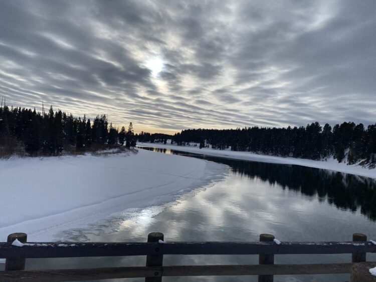 GOIN’ FISHIN’ – Our next stop was the Fishing Bridge on the Yellowstone River. We met Ranger Mary at the warming lodge where she maintains a fire to keep park visitors warm. Fishing Bridge was a place where we stood and simply looked up and down the river seeking the elusive river otter (alas, there were none) and enjoying the serenity of the moment.